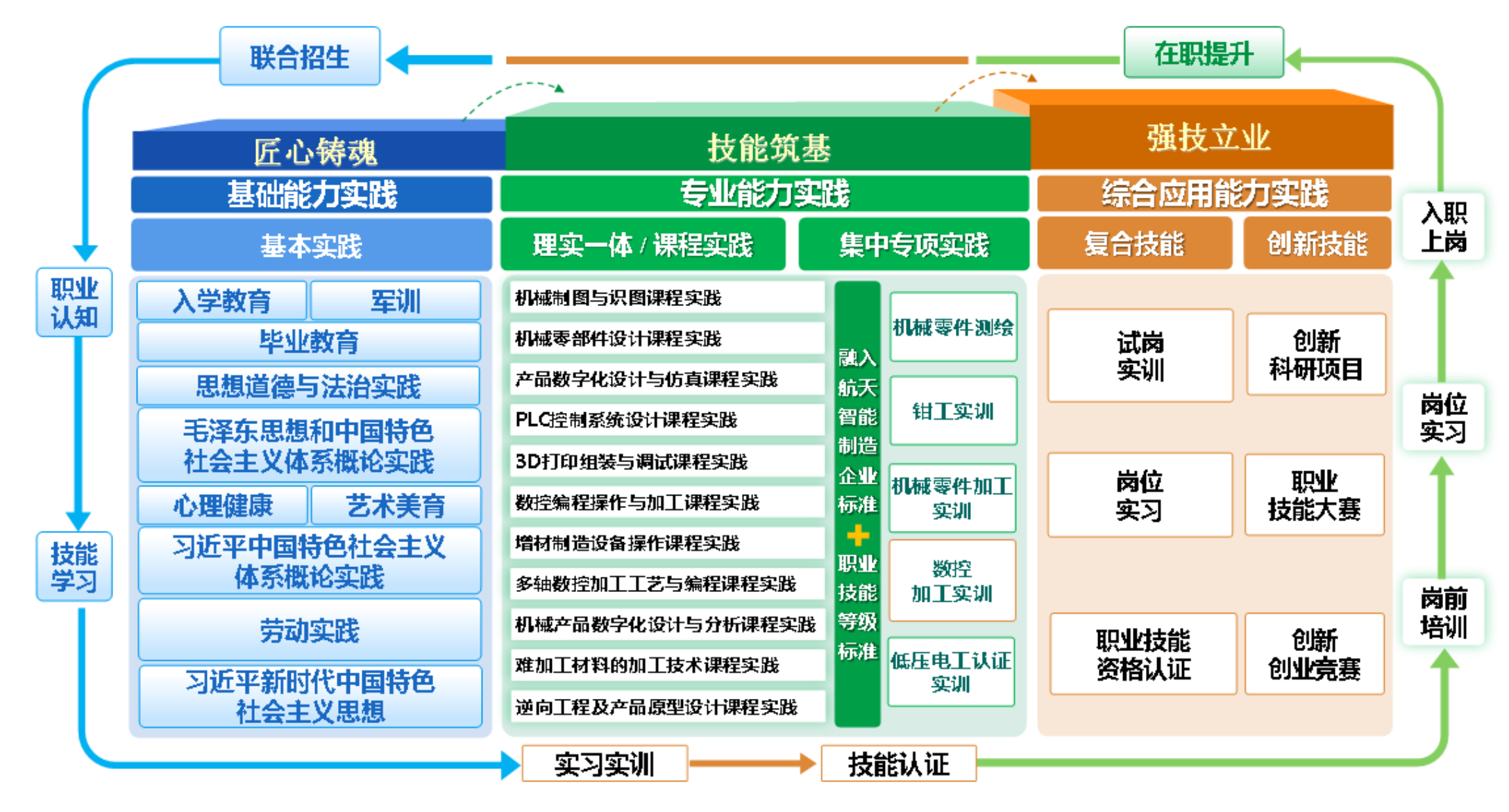 (2)专业教学内容与职业岗位对接,重视学生专业技能提升,以数字化机械设计、精密加工、智能制造产线、智能装备维护为主线,建立智能化、数字化、可视化、精益化智能制造课程体系,注重培养学生的哲学思维、美学思维、伦理思维、计算思维、数据思维、交互思维、互联网思维能力。