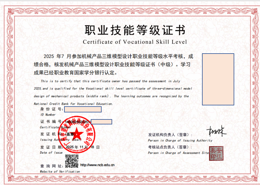 机械工程制图(中级)、低压电工操作、机械数字化设计与制造(中级)、机械产品三维模型设计(中级)、多轴数控加工(中级)、机器视觉系统应用(中级)以及工业互联网设备数据采集(中级)。